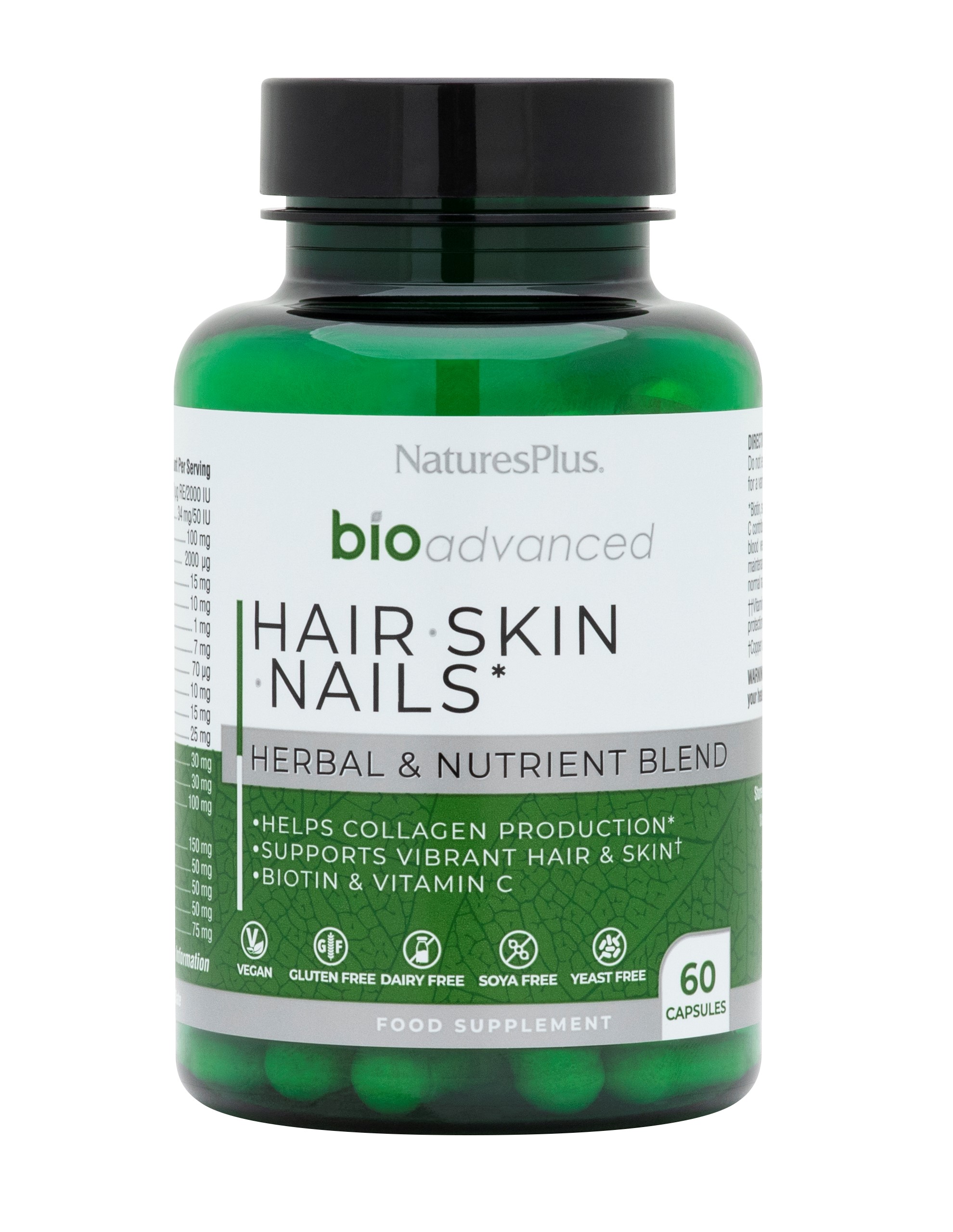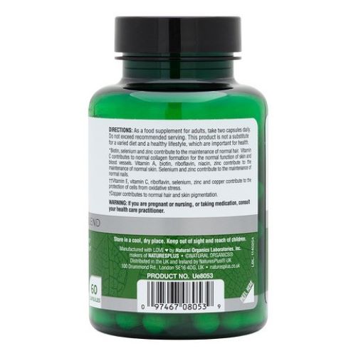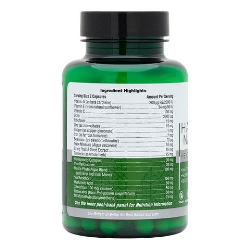 Ingredients: Vitamin A (as beta carotene) (2000 IU); Vitamin E (from sunflower seed oil); Vitamin C (as ascorbyl palmitate, calcium ascorbate, magnesium ascorbate, potassium ascorbate, zinc ascorbate), Riboflavin, Niacin (as nicotinamide), Biotin, Iron (as ferrous fumarate), Zinc (as zinc sulfate, ascorbate), Copper (as copper gluconate), Manganese (as manganese sulfate); Selenium (as selenomethionine); Sea Buckthorn (Hippophae rhamnoides fruit) (rich in Omega 3, Omega 6, Omega 7, Omega 9; Bamboo (Bambusa vulgaris stem) (supplying naturally occurring silica) Marine Phyto Algae Blend; Kelp [Ascophyllum nodosum] (35mg), Irish Moss [Chondrus crispus] (32 mg), Spirulina [Spirulina platensis] (20mg) , Lithothamnion Spp. (5mg), Dulse (Palmaria palmata) (5mg), Laminaria digitata (3mg); Methylsulfonylmethane (MSM), Hyaluronic Acid (as sodium hyaluronate), Resveratrol (from Polygonum cuspidatum root); Pine Bark Extract (Pinus pinaster) (naturally rich in proanthocyanidins) ; Turmeric (Curcuma longa rhizome); Quercertin (Dimorphandra mollis fruit); Grape Fruit & Seed Extract (Vitis vinifera); Sweet Orange Fruit Extract (Citrus sinensis) (naturally occurring bioflavonoids); Trace Mineral Complex (Algas calcareas)