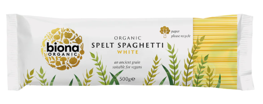 Now in 100% plastic-free paper bags that can be easily recycled. Biona Organic White Spelt Spaghetti is sourced from one of the oldest cultivated grains, and an ancient cousin of wheat; spelt. Spelt is high in fibre, has a higher content of protein and vitamins than wheat and although not gluten free, is often tolerated by some people with wheat allergies.