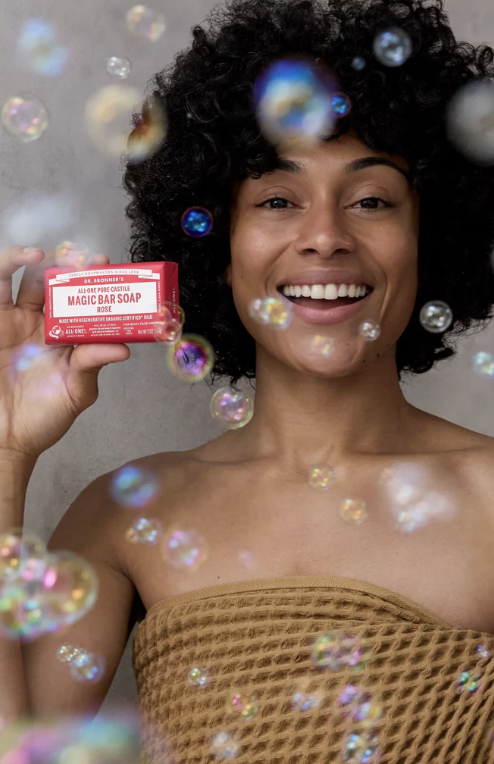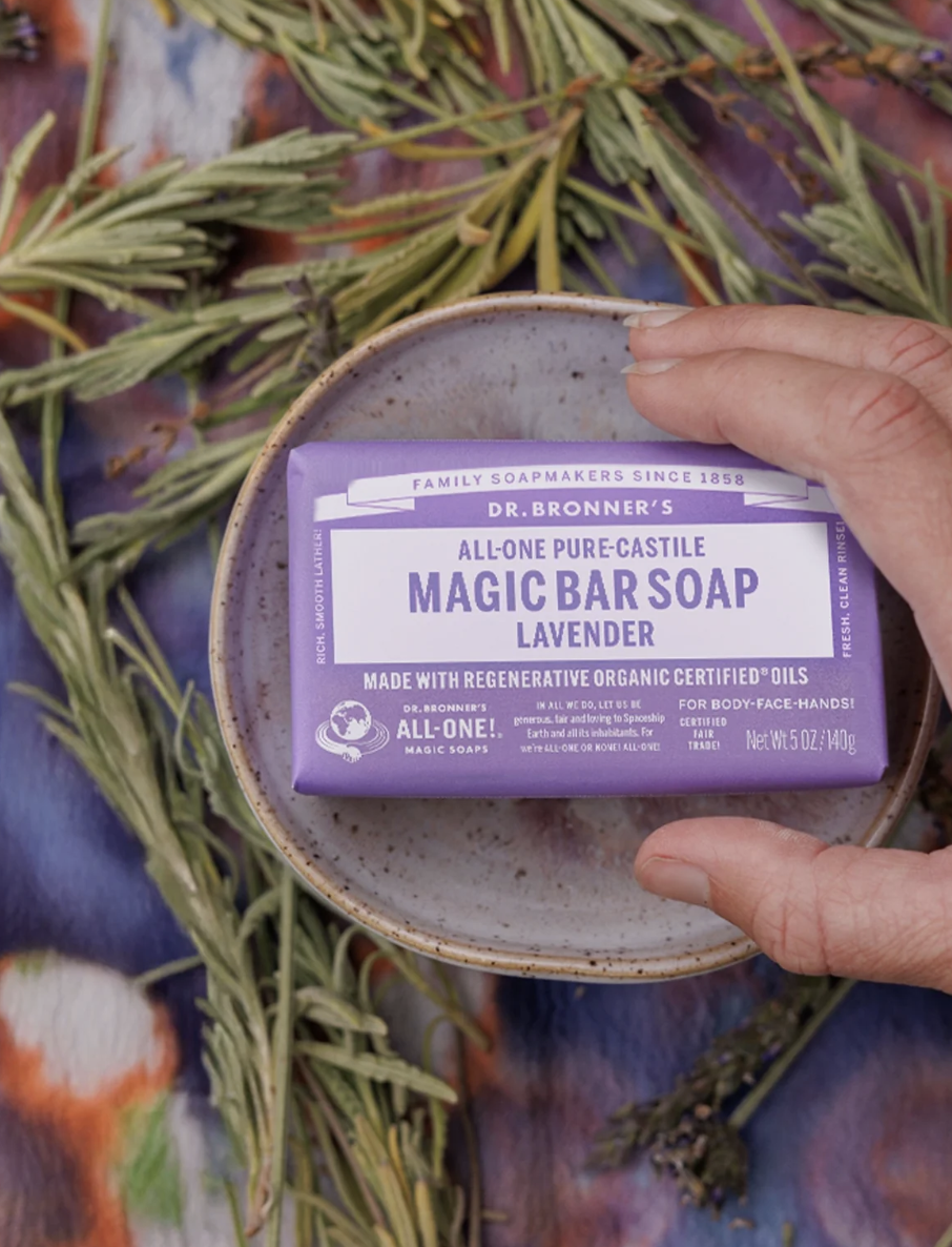 Dr. Bronner’s Pure-Castile Bar Soaps are vegan, gentle and versatile, good for washing body, face or hair! Enjoy only 2 cosmetics, enough sleep & Dr. Bronner’s Magic Soaps to clean-body-mind-soul-spirit instantly uniting One! All-One!! Read Lisa Bronner’s Bar Soaps Dilutions Cheat Sheet.