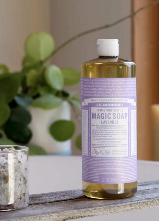 Dr. Bronner’s 18-in-1 Pure-Castile Soaps are multi-surface all-purpose cleaners good for just about any task. Wash face, body, hair, hands! Clean toilets, bathtubs, countertops, dishes—great for laundry, mopping, pets, and aromatherapy—with no synthetic preservatives, detergents or foaming agents—none! Dilute! Dilute! OK!! For detailed product uses, read Lisa Bronner’s