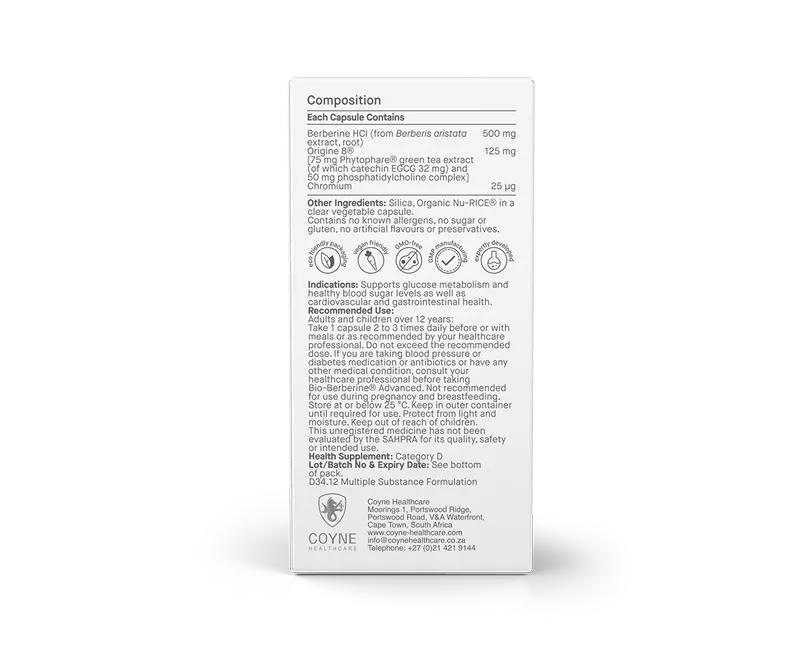 In every capsule of Bio-Berberine® Advanced, the benefits of 500 mg berberine are further enhanced by 125 mg of Origine 8® – a highly bioavailable liposome-infused and polyphenol-rich green tea extract – and 25 ug chromium, an essential trace mineral that can improve insulin sensitivity and enhance protein, carbohydrate, and lipid metabolism.