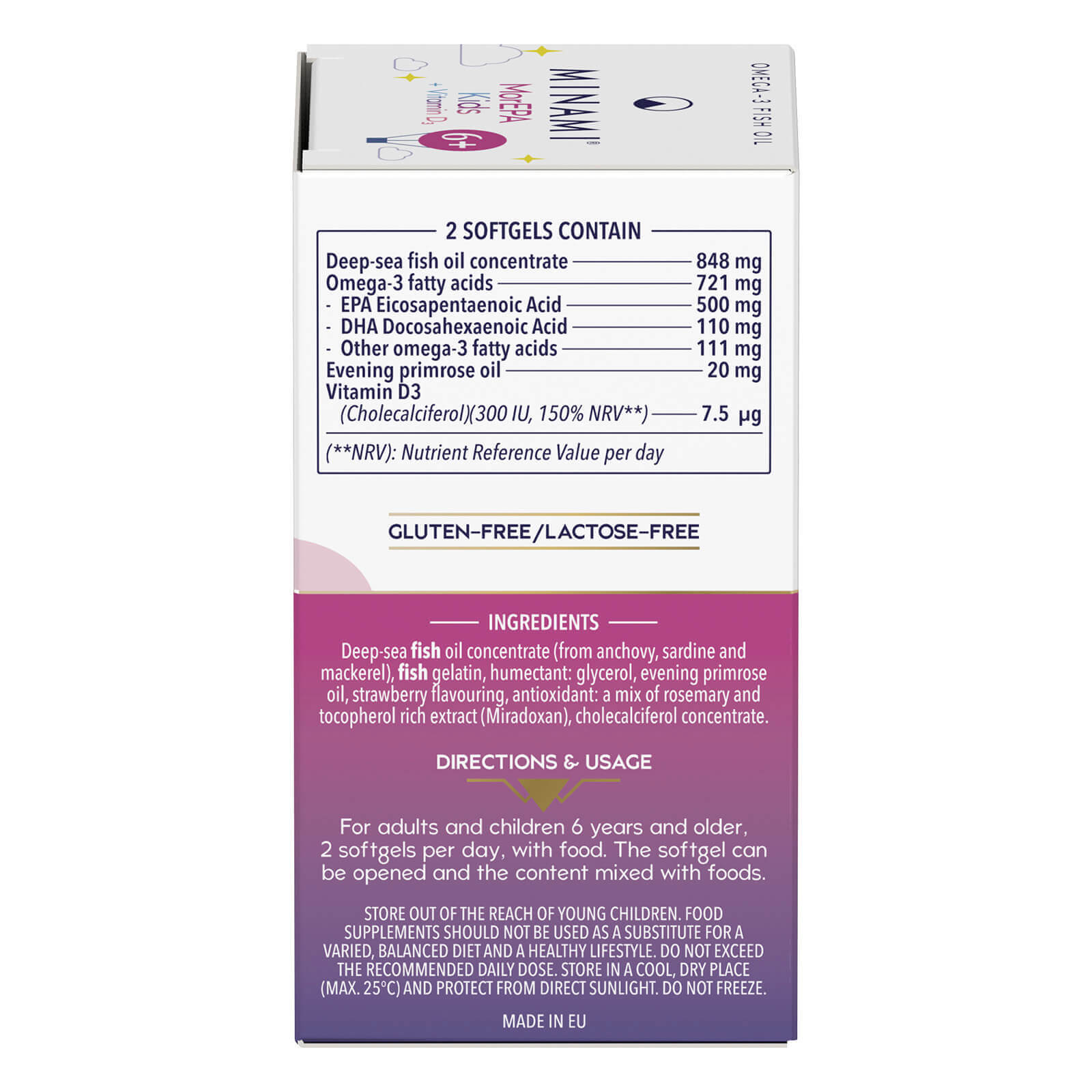 Adults and children over six should take maximum two softgels per day with food. They can be swallowed with sips of water, or opened and the contents mixed with the meal.
