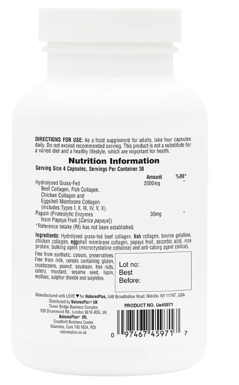 Collagen is the most abundant protein in the body and is a key component of hair, skin, nails, joints, gut and much more. Collagen provides support and functionality to all tissues and systems of the body, and is the primary structural protein, responsible for shape and strength.*These statements have not been evaluated by the Food and Drug Administration. This product is not intended to diagnose, treat, cure or prevent any disease. Collagen Peptides Capsules by NaturesPlus provide the whole-food nutrition that our bodies crave and a great way to get this outstanding natural protein into our daily diet.