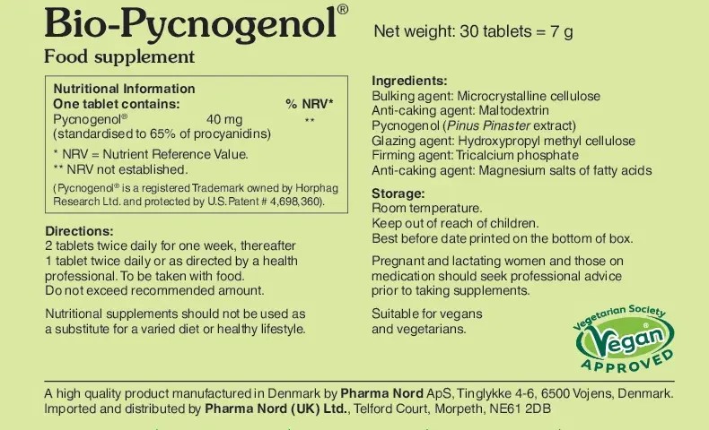 Studies demonstrate that Pycnogenol antioxidants are particularly effective for maintaining the healthy functioning of blood vessels and the eyes, and can help to support a normal response by the body to an allergic or inflammatory challenge. Pycnogenol tablets may also contribute to healthy skin by maintaining its strength, flexibility and suppleness to combat the ageing process.