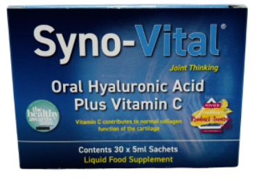Syno-Vital sachets with Vitamin C contains Hyaluronic Acid (HA) which is a natural component of the body. Hyaluronic Acid is present in the synovial fluid of the joints and the vitreous fluid of the eye. It’s also most abundantly found in the skin, but our levels of HA throughout the body deplete as we age.