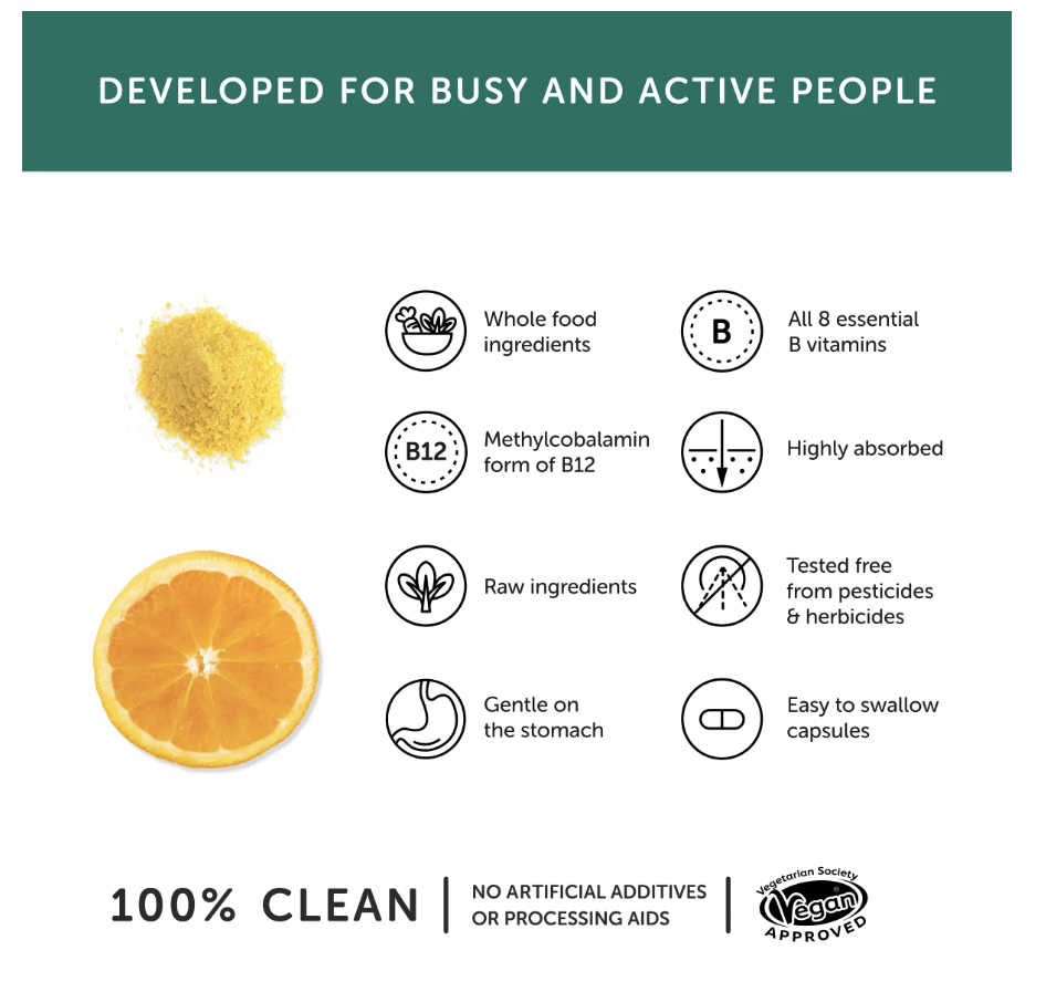 We’ve taken all the goodness from nature’s finest offerings and made our B Complex with nutritional yeast and whole citrus pulp. All of our whole food ingredients are raw and complete. Using carefully controlled low-heat conditions, we preserve the naturally occurring co-factors you find in fresh foods, like live enzymes and phytonutrients, amino acids, trace minerals and other bioactive co-factors.