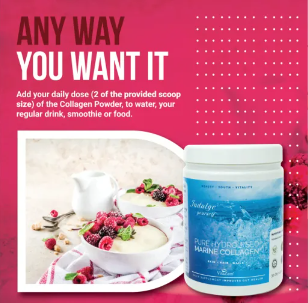 Pure Hydrolysed Marine Collagen bottle net weight is 300g. Vitazam recommends 10 grams of powder collagen daily. The scoop is already provided in the box. You can mix this pure Collagen in smoothies or cold shakes because it can be easily blended in cold shakes. We recommend using our Collagen for at least three weeks to get the best results. You will notice a considerable change in your skin’s wrinkles condition.