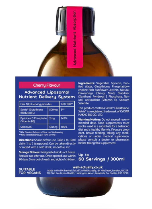 Well.Actually. Liposomal Glutathione liquid contains powerful 500mg of ‘Setria®’ Reduced L Glutathione in a highly-absorbed form to achieve optimal delivery and effect for supporting your immune, detox and skin health.